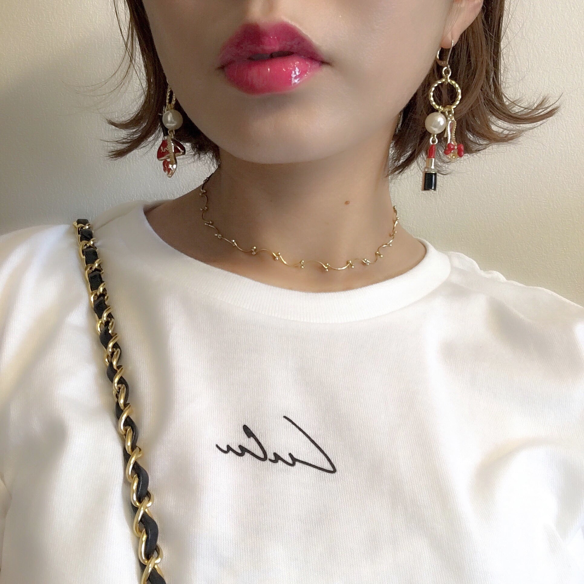 立体的なレディーなヒール、リップ、ネイルモチーフの揺れるタイプのアシンメトリーイヤーアクセ。