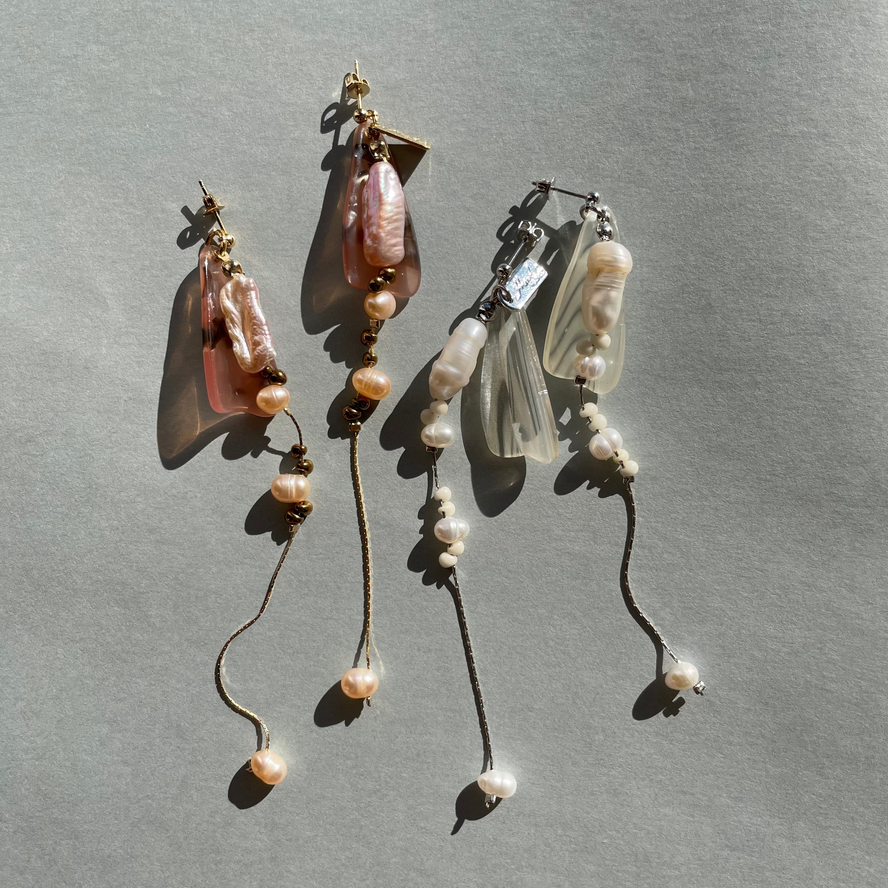 淡水パールとアクリル、チェーンが耳元で美しく揺れます。
