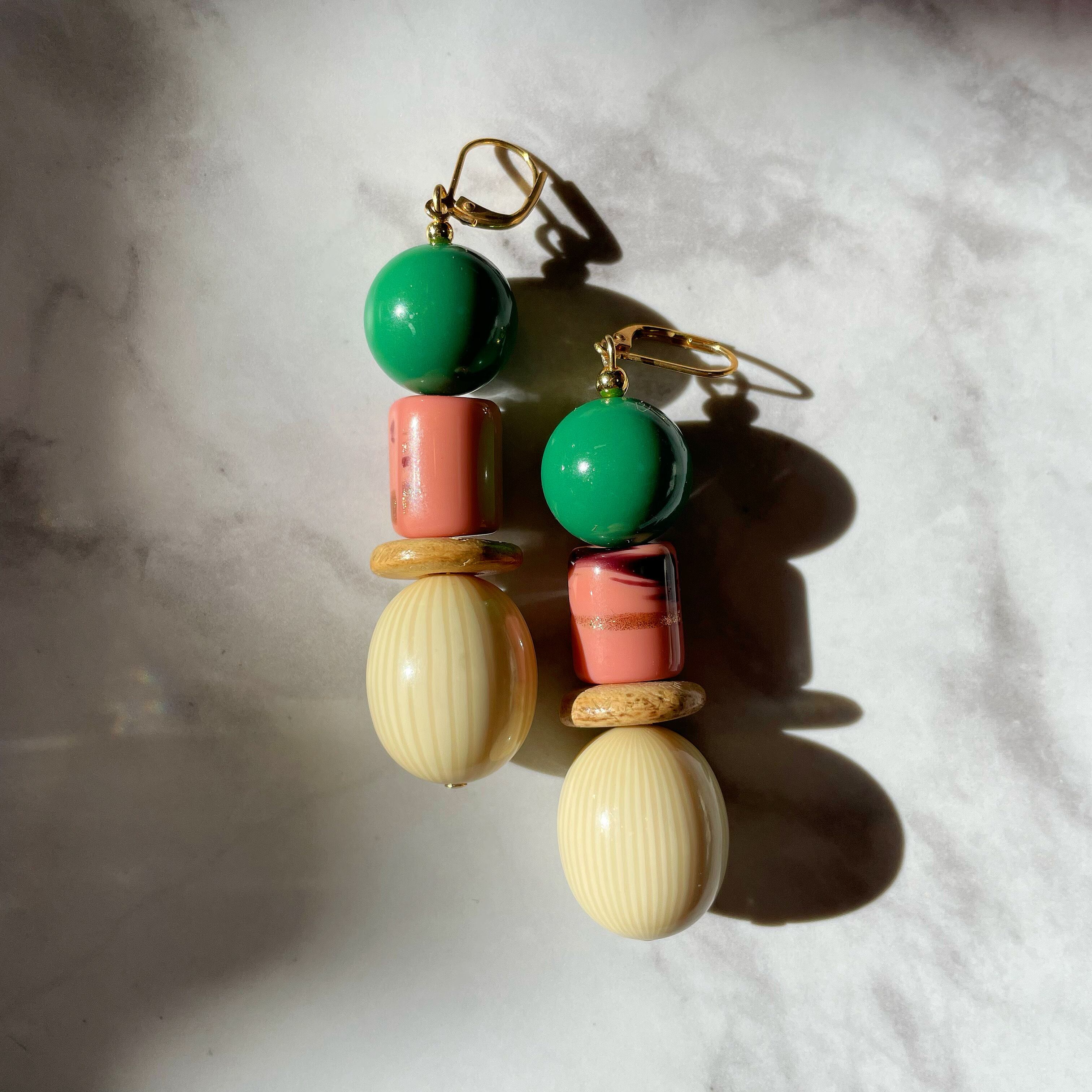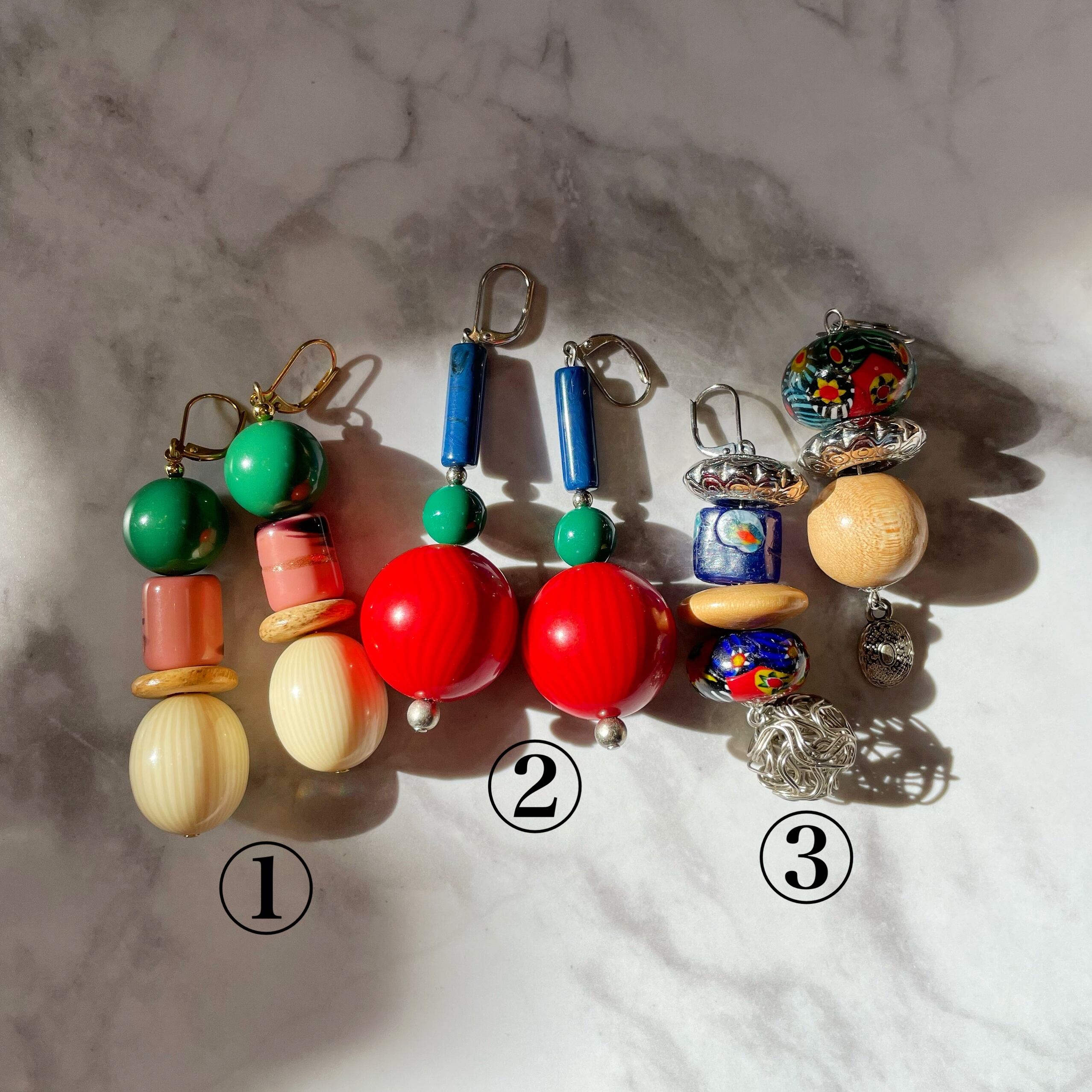 ③はアシンメトリーで、両方ともウッドビーズが入っています。